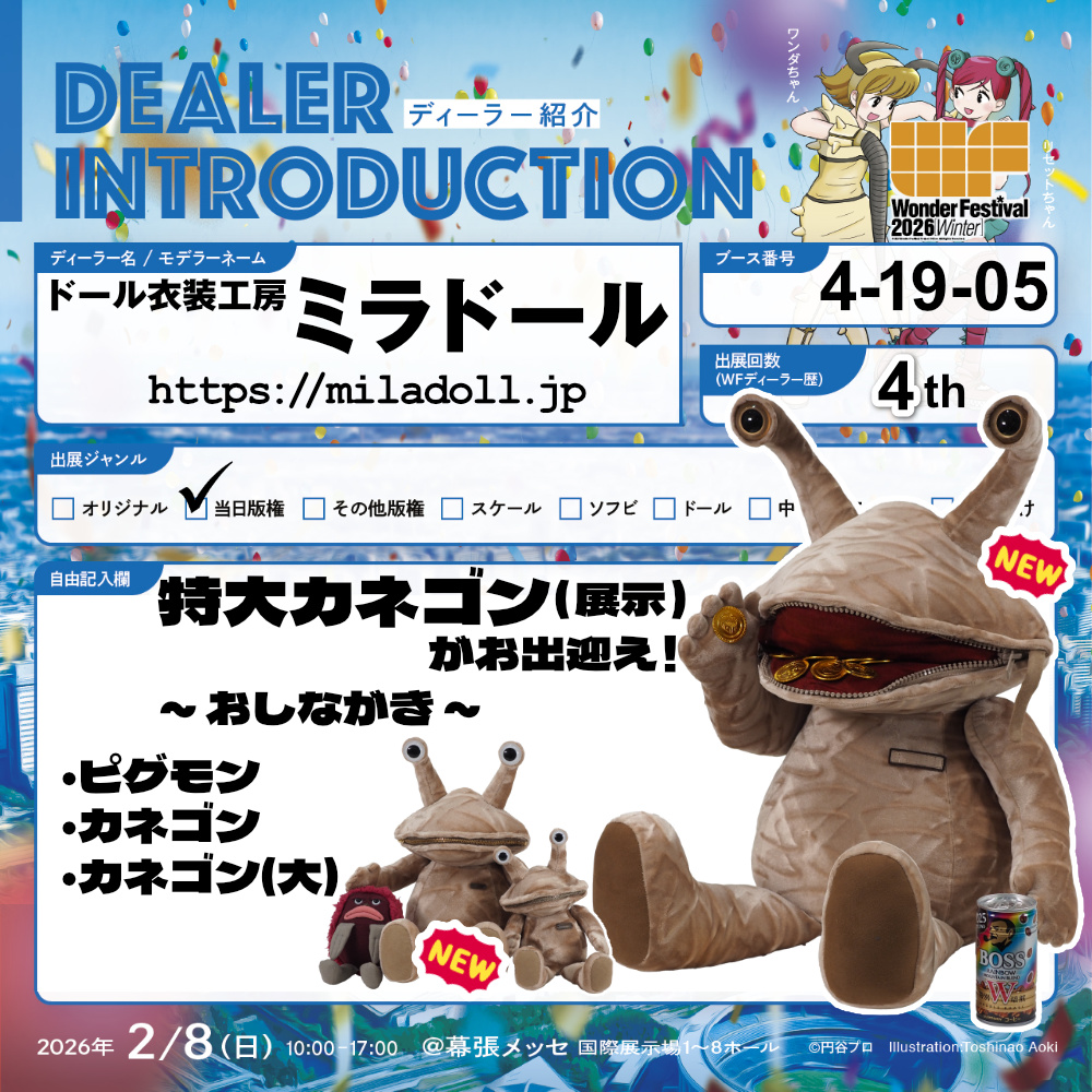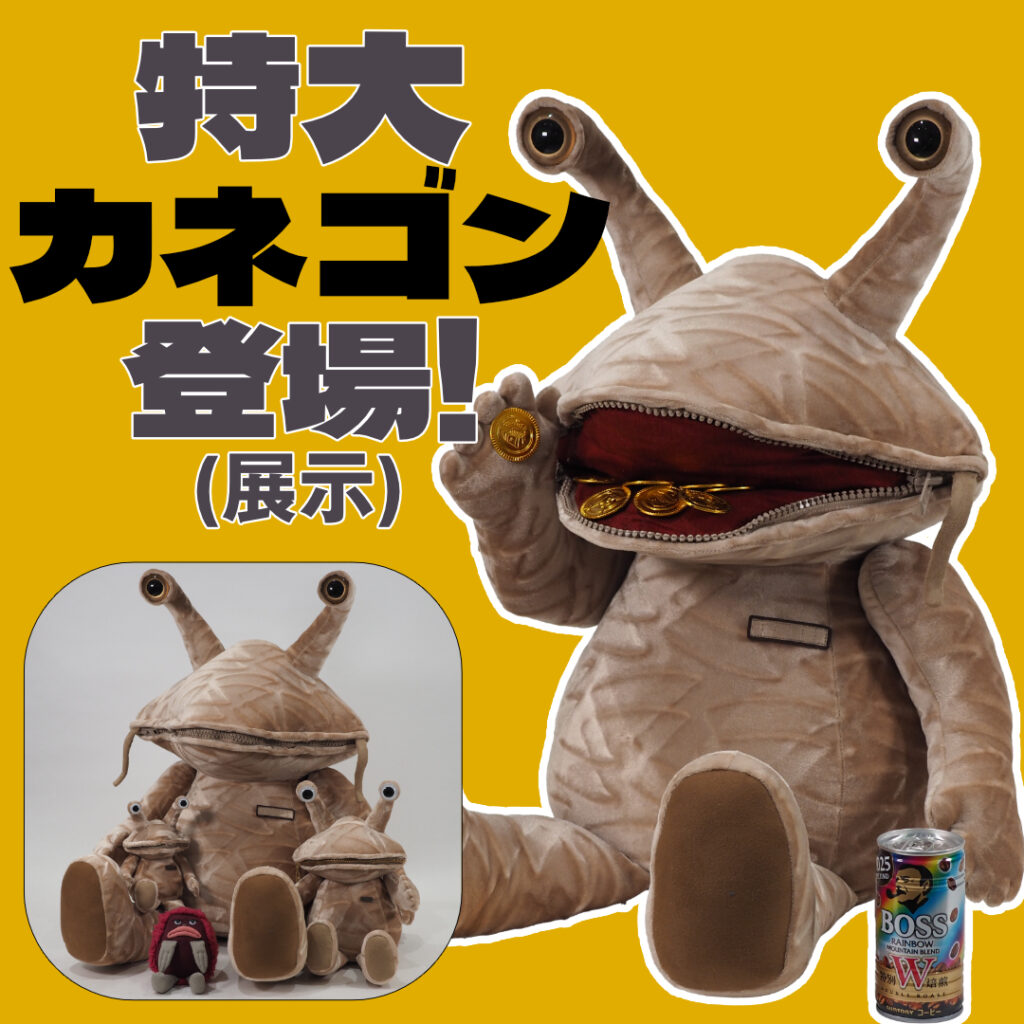「ウルトラQ」に登場する「カネゴン」を、特大サイズのぬいぐるみとして再現しました。霊験あらたか(?)なコイン怪獣です。ぜひブースにご来訪のうえ、お参りください。もちろん写真撮影もOKです!